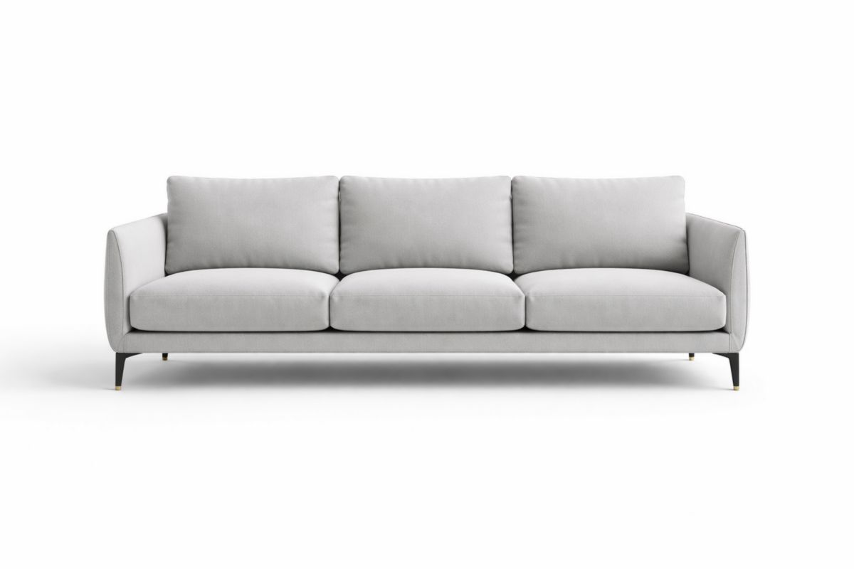 Dieses Dreisitzer-Sofa verfügt über einen Massivholzrahmen und ist mit hellgrauem Polyestergewebe bezogen. Die abnehmbaren Sitz- und Rückenkissen sind mit Schaumstoff gefüllt. Edelstahlbeine. Die Abmessungen betragen 250 cm Länge × 90 cm Breite × 85 cm Höhe, Gewicht: 40 kg.